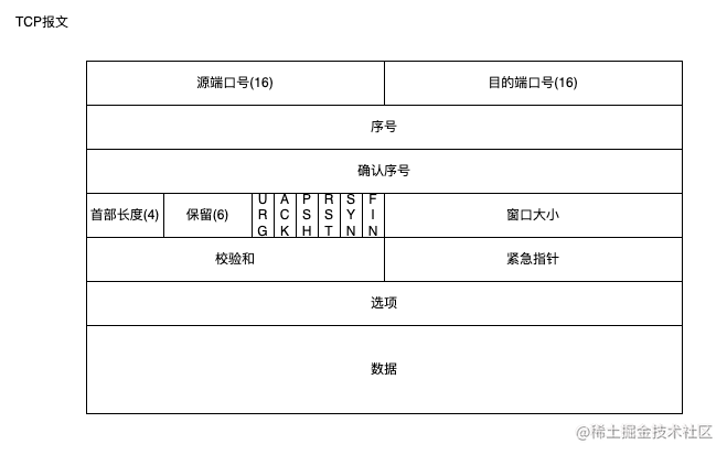 - 第一次:发送方发送带有 SYN=1 字段的 TCP 报文到接收方