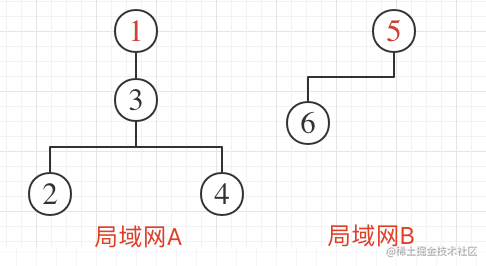 - 同样地,将[5,6]两个节点也连接起来,取名为局域网 B,其中节点 5 为根节点