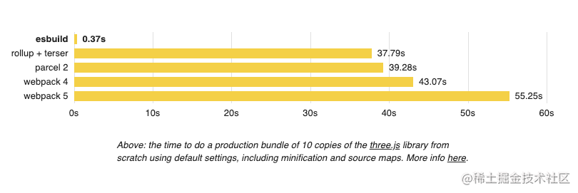 esbuild 最主要的一个特征就是有极致的性能,那么它到底有多快,参考 esbuild 官方提供的一张图