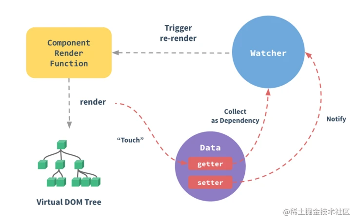 下面是 vue 官网双向绑定原理的图,他是通过Object.defineProperty或者new Proxy去监听对象数据变化,对象相当于一个发布者(publisher),当监听到对象改变后对象的setter就会发送消息通知订阅者(watcher),订阅者收到消息后通知对 DOM 文本进行update操作。
