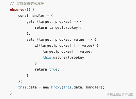 上面图是用 Proxy 实现一个双向绑定的部分代码,从代码片段中可以看到observer作为一个发布者,它可以同时被多个变量订阅,当监听到数据发生改变时,调用set方法通知watcher(订阅者)去改变 node 节点和值。