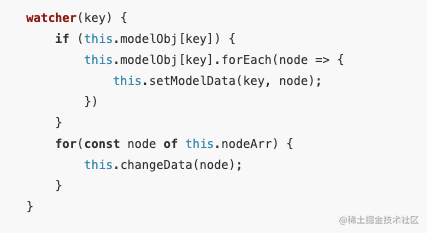 同理,上图代码描述的是,当我们给input输入框作为一个发布者,watcher作为订阅者。当用户输入数据时,发布者(input) 向订阅者(watcher) 发送改变信息的通知,watcher收到通知后进行值得修改和 node 节点数据更改,这就是 vue 通过发布订阅模式实现的数据双向绑定。