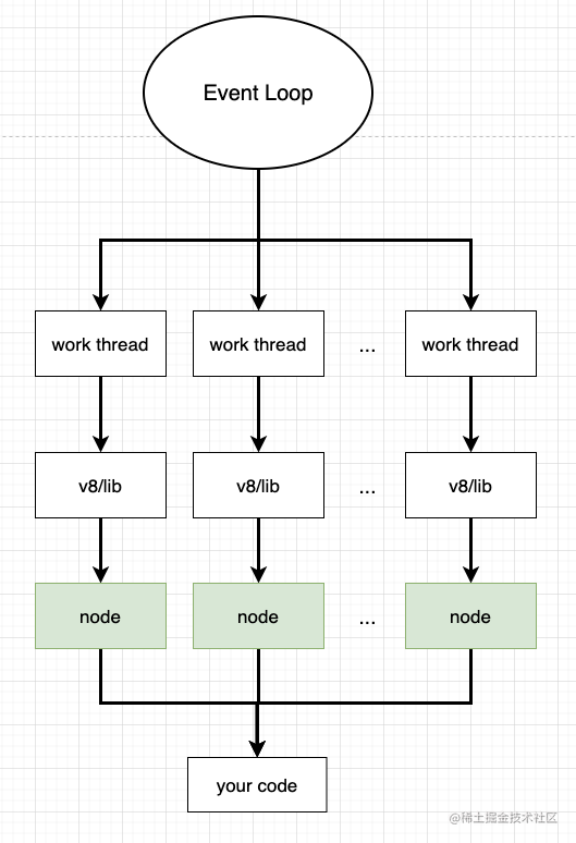 我们以前 Javascript 都是单线程然后利用一个事件循环队列(event loop)不断监听执行栈是否有函数进入。对于 worker_thread,其实可以理解为一个event loop中有多个 javascript 工作线程,创建一个线程相当于创建一个新的 js 执行环境。多线程的运行如下图