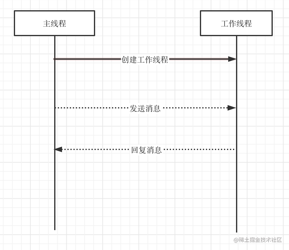 上面代码在主线程的时候调用创建工作线程的方法,创建一个工作线程并且新增一个,而创建工作线程后调用主线程的端口向工作线程发送消息,工作线程接受到消息后再向主线程回应。大概的流程图如下