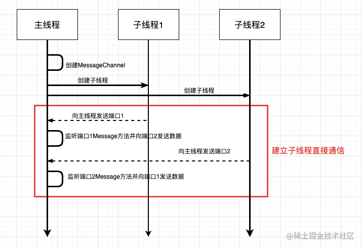 从代码实现可以看到,最终建立子线程直接通信的步骤还是在主线程的 message 事件中。建立通信的流程图如下