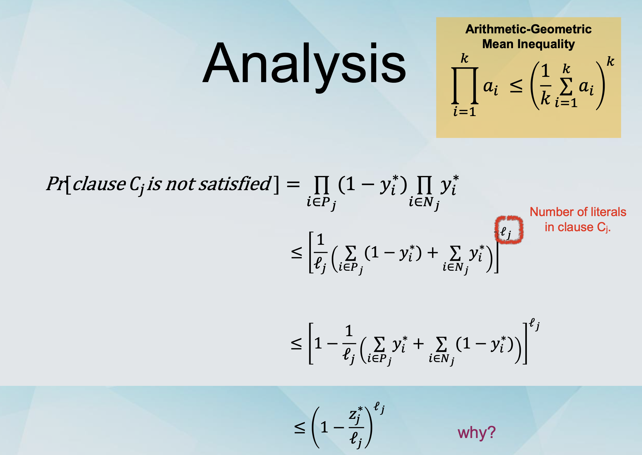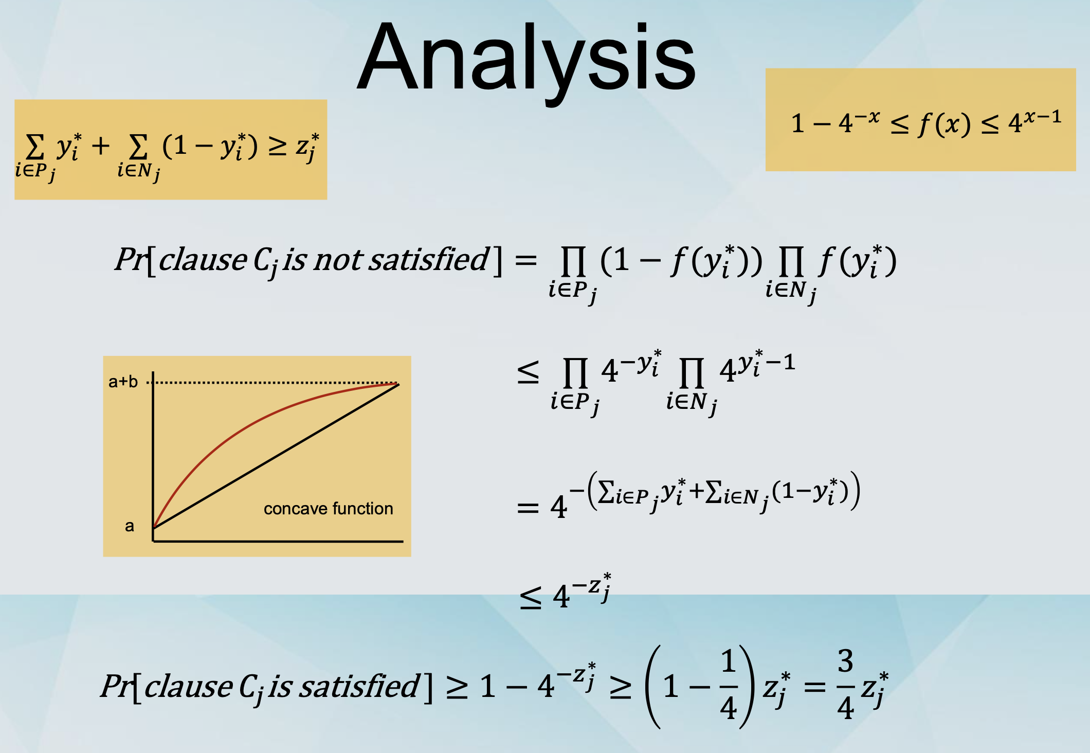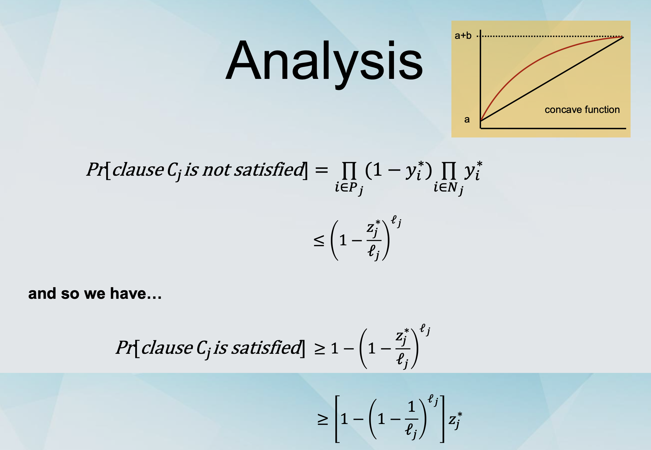 - e.g., if y* = (1/3, 1/4, 5/6, 1/2, …) we will set variables x1, x2, x3, x4, … to true with probabilities 1/3, 1/4, 5/6, 1/2, … respectively.