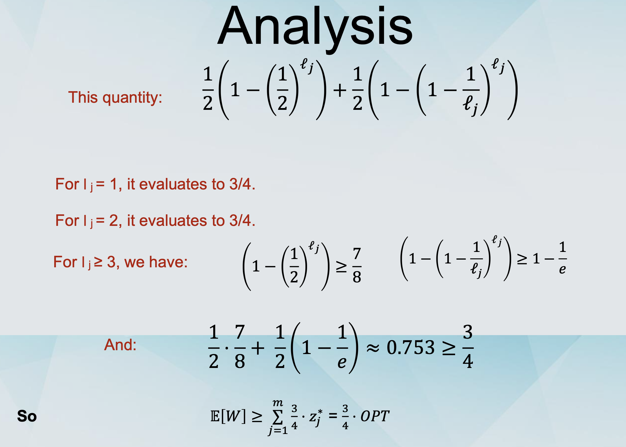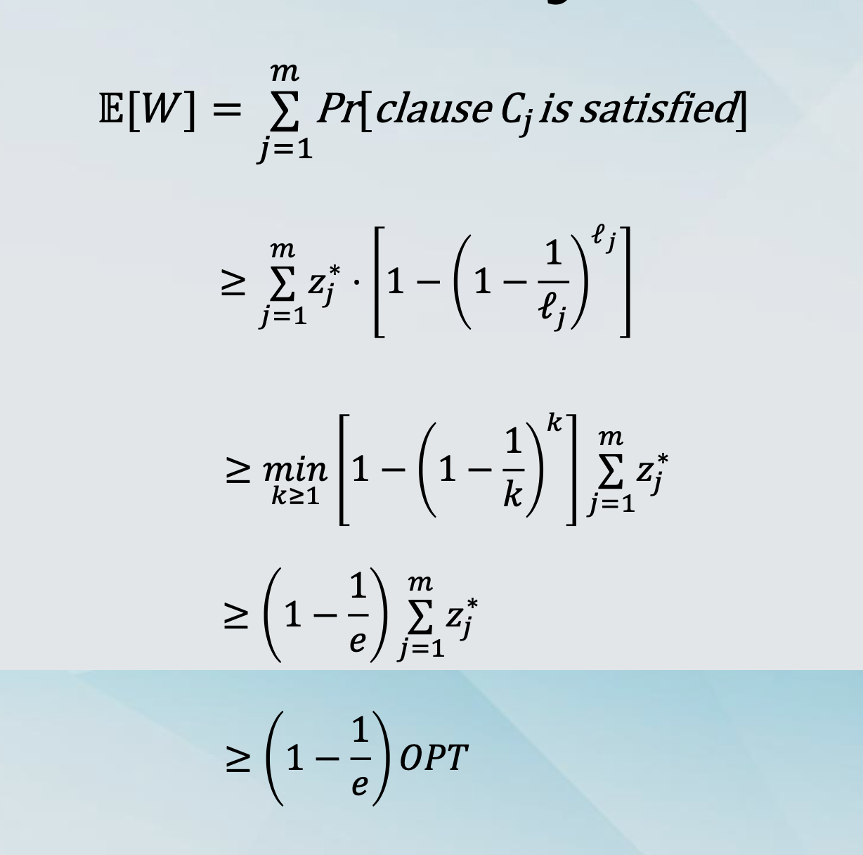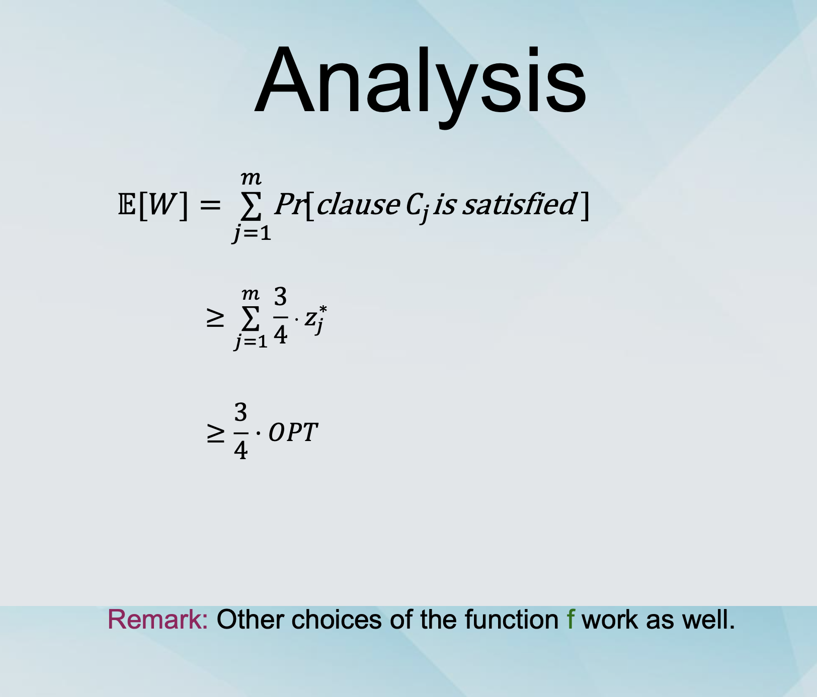 - e.g., if y* = (1/3, 1/4, 5/6, 1/2, …) we will set variables x1, x2, x3, x4, … to true with probabilities 1/3, 1/4, 5/6, 1/2, … respectively.