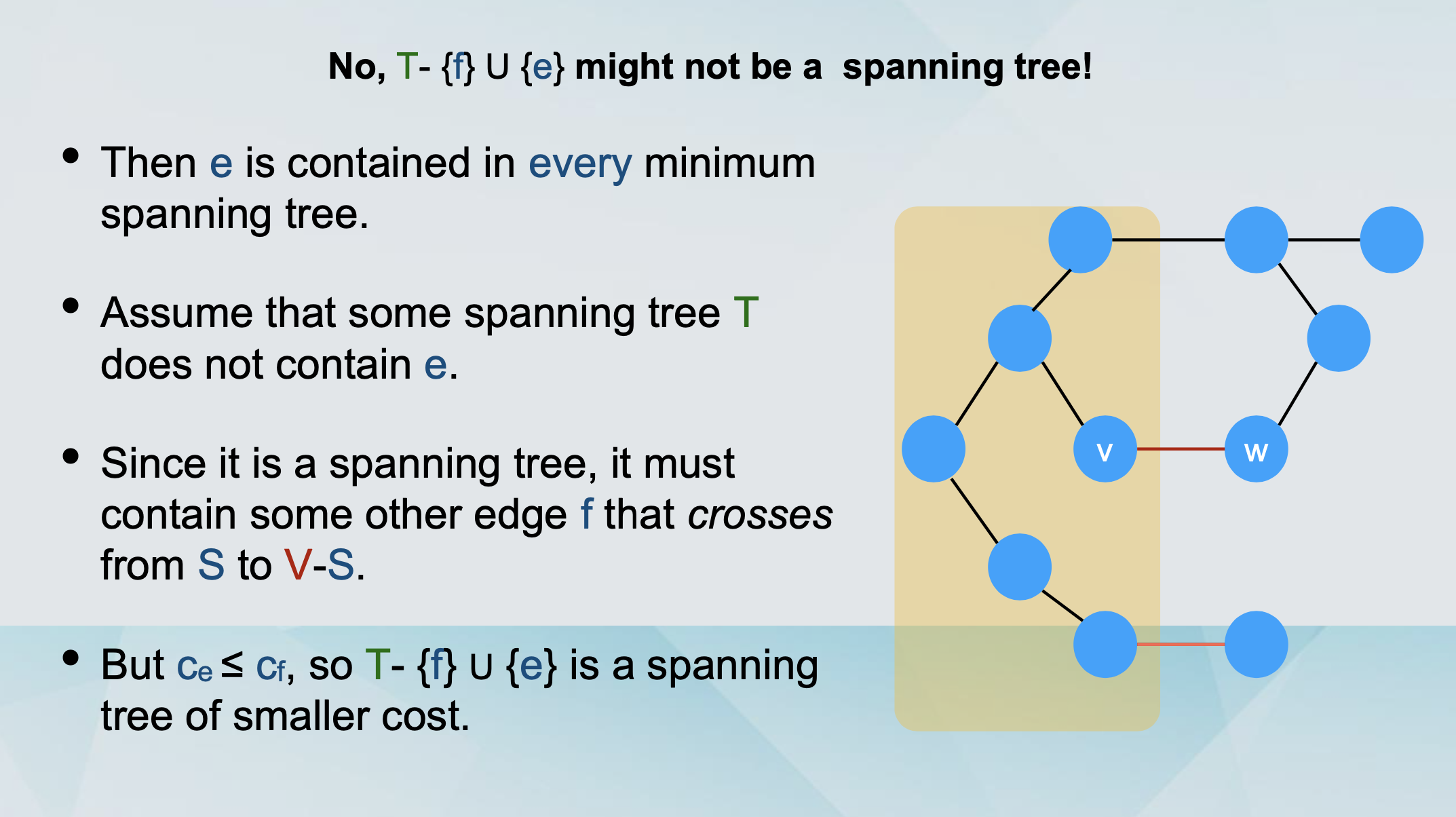 (V, T-{e}) is a valid solution, and it is cheaper. Contradiction!