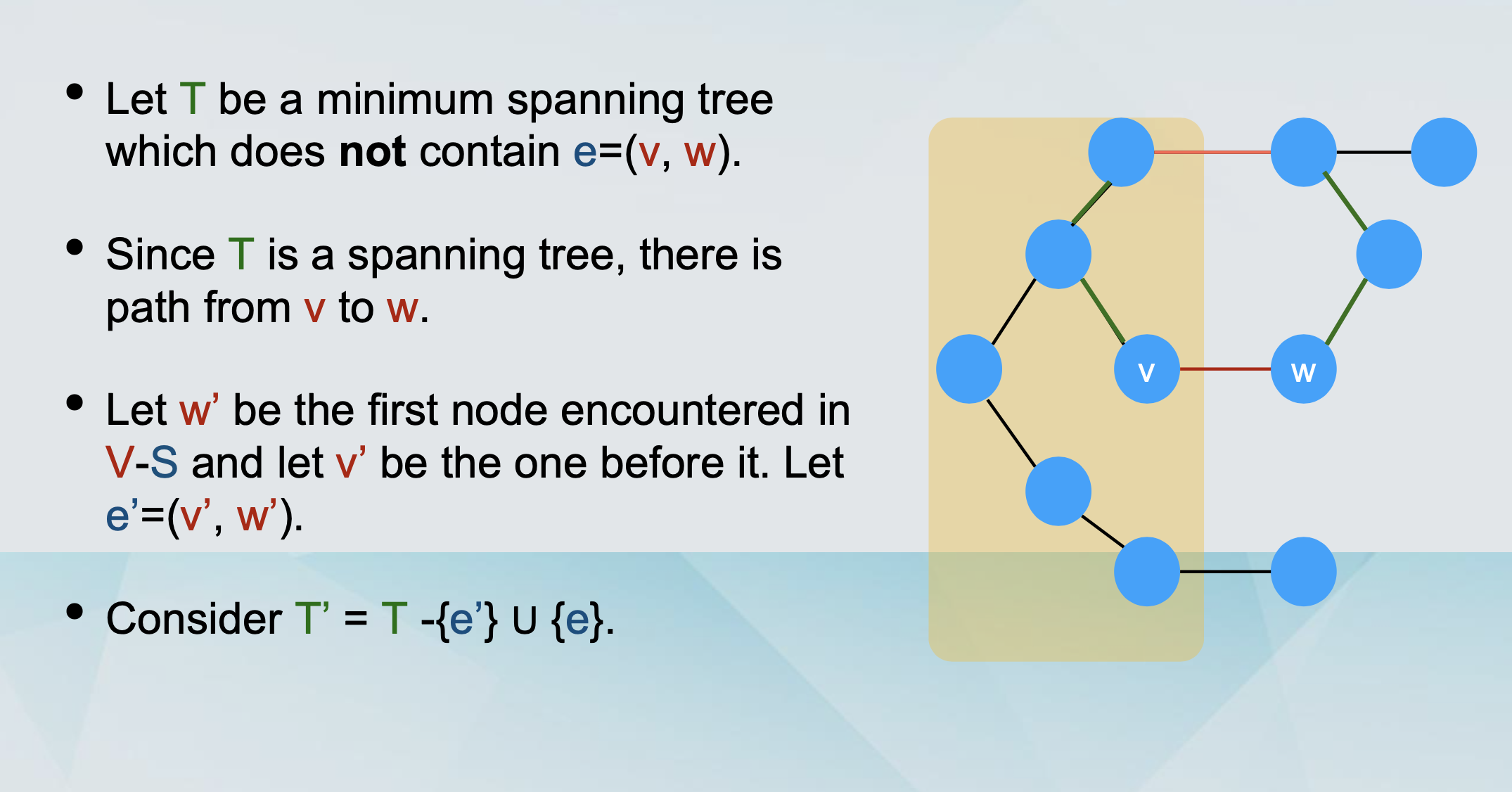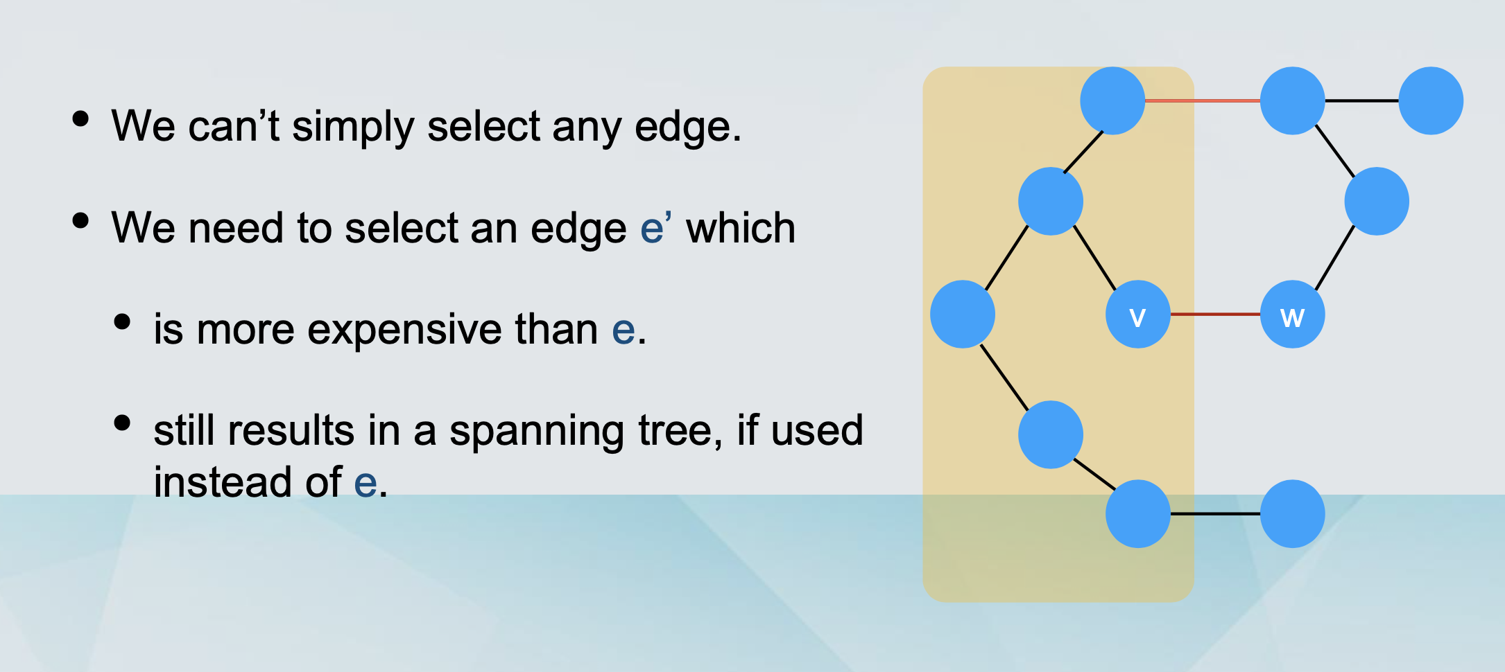 We will substitute e with another edge e’, resulting in a cheaper spanning tree.