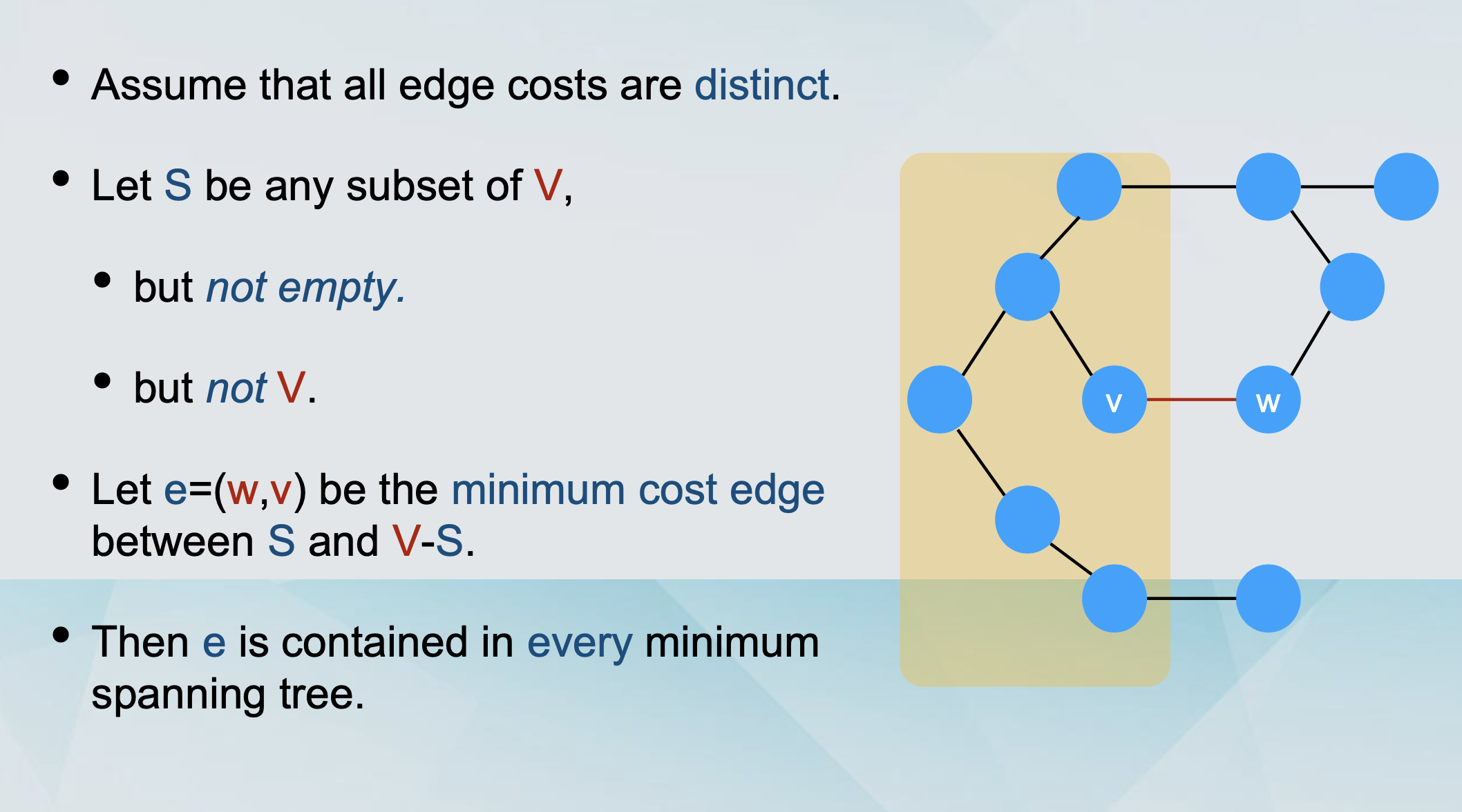 This edge has one endpoint in S and one in V-S and has minimum cost.