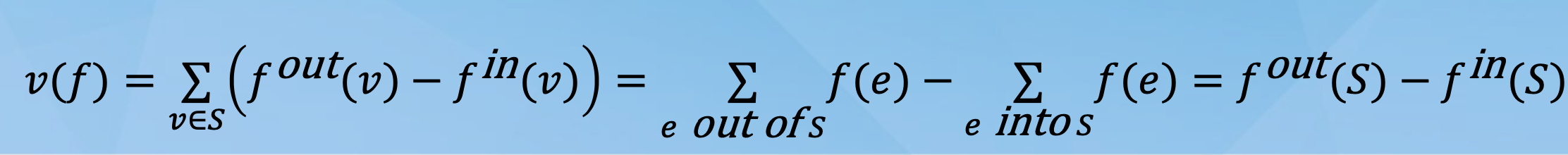 Fact 1: Let f by any (s-t) flow and (S, T) be any (s-t) cut. Then v(f) = fout(S) - fin(S).