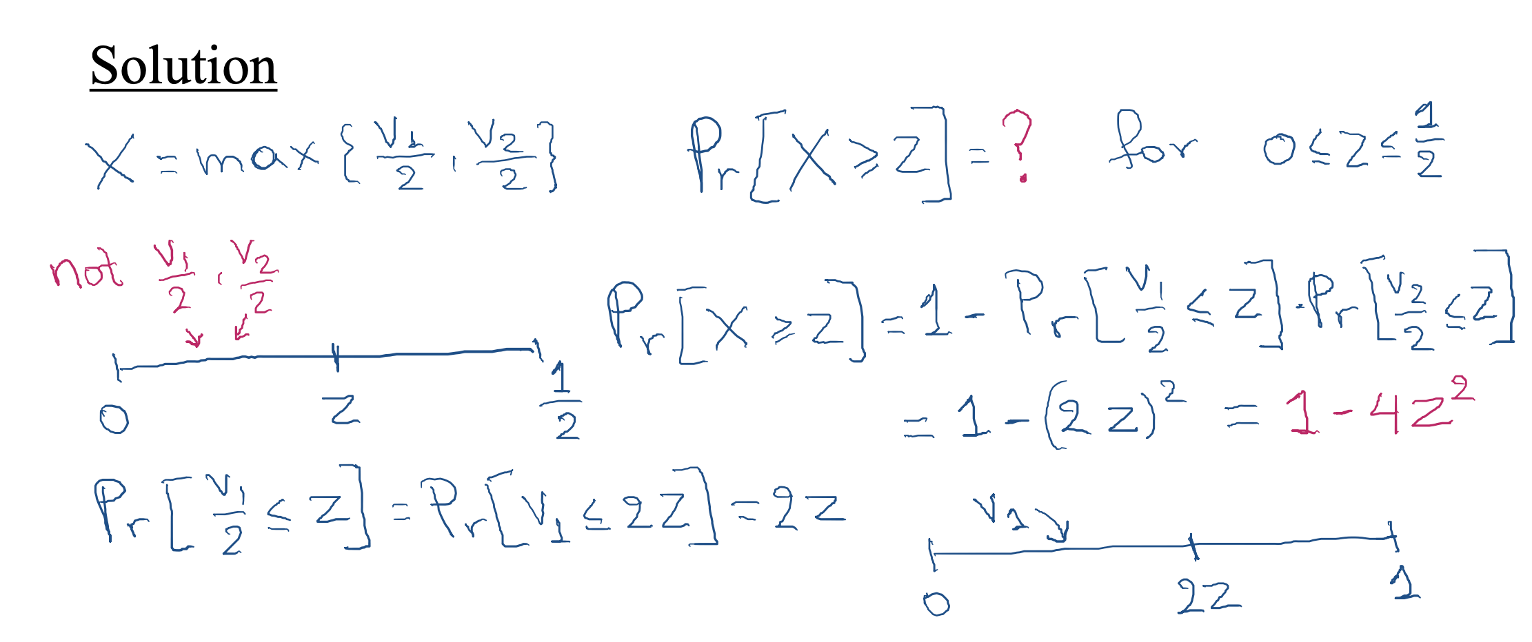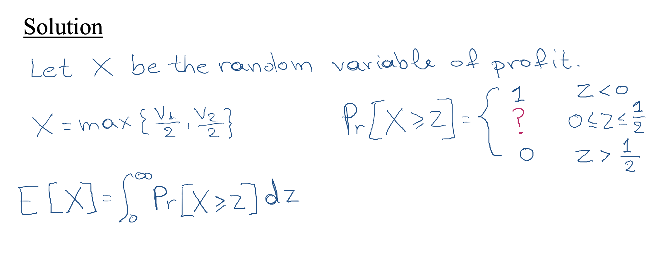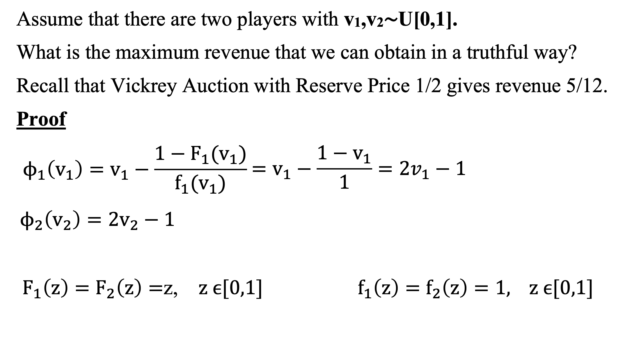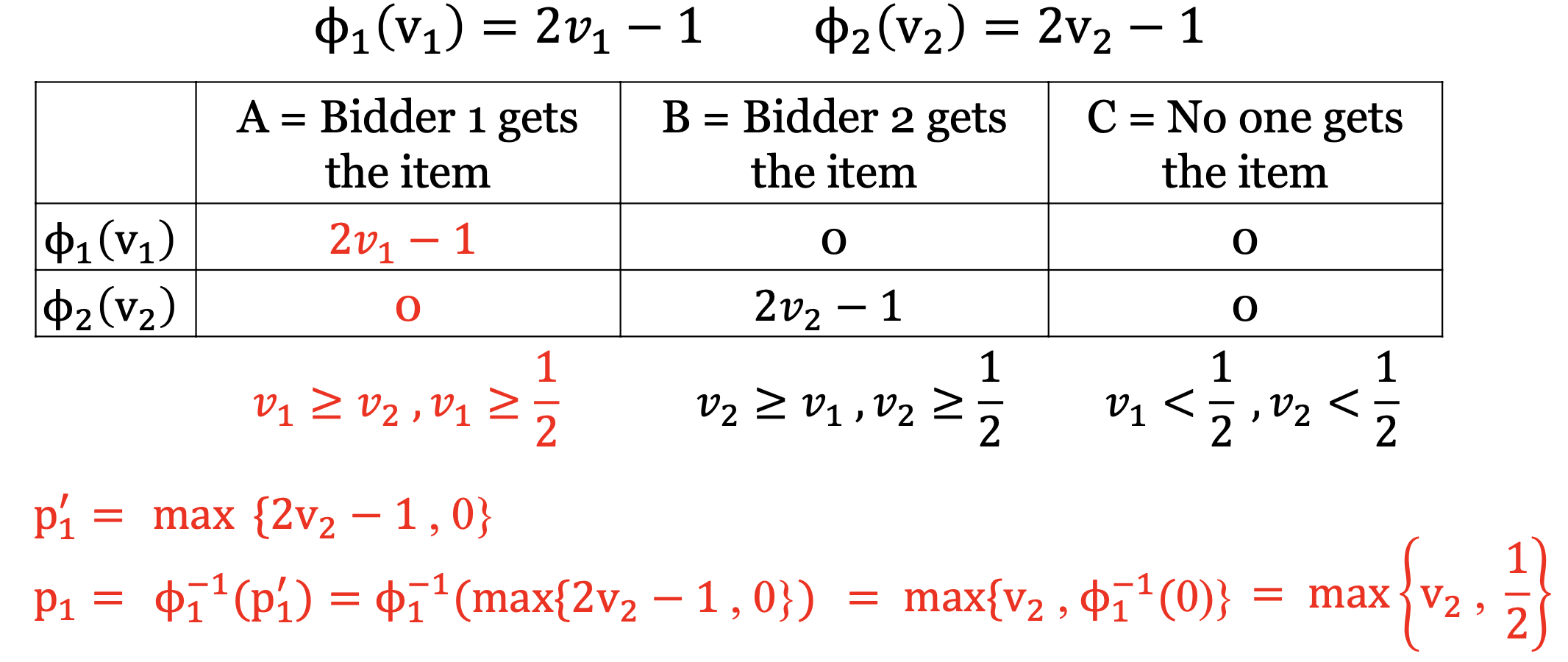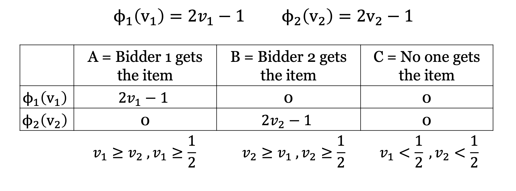 if v1 < 1/2 and v2 ≥ 1/2 we allocate the item to bidder 2 for price of 1/2