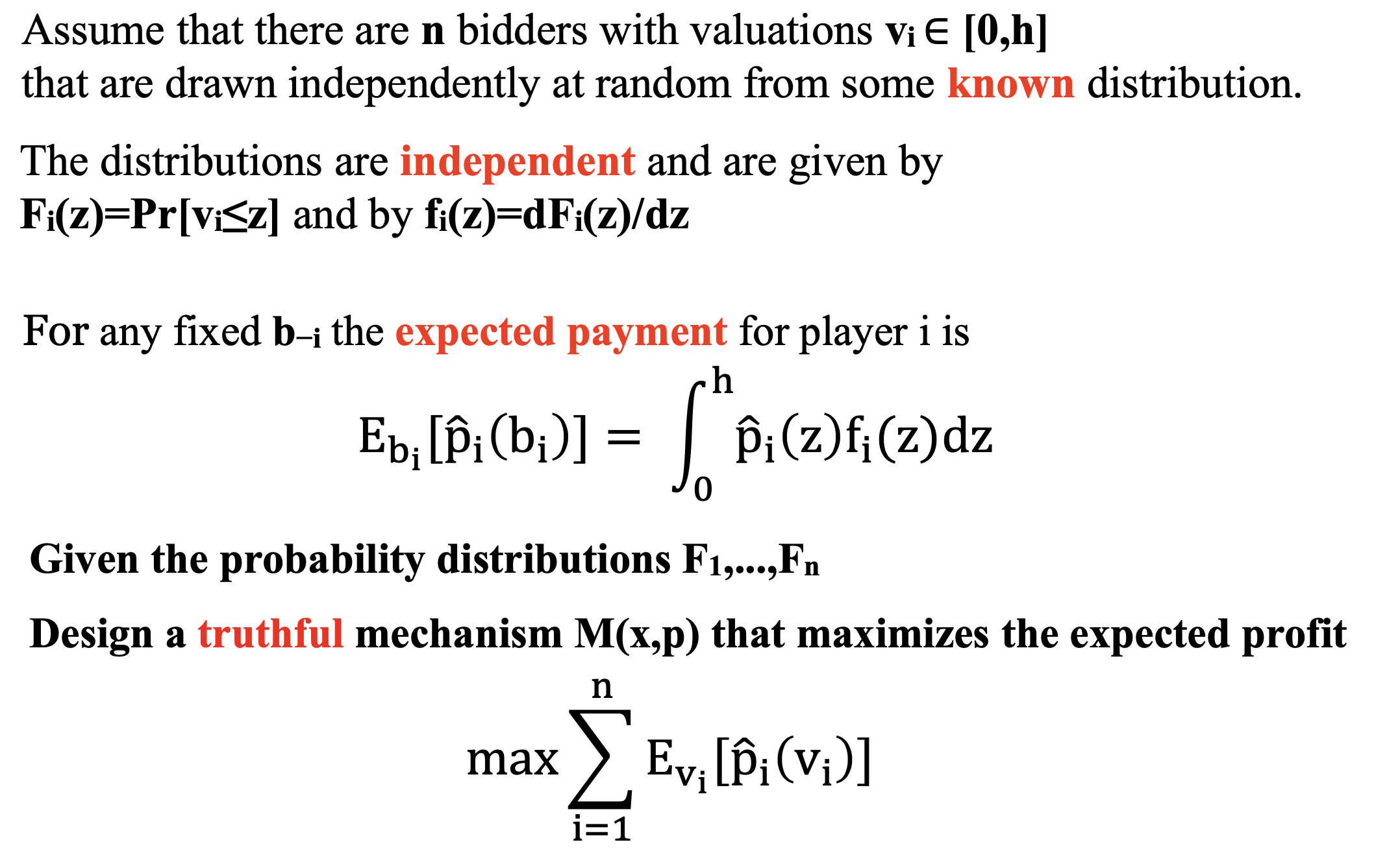 Assume that the valuations come from a known probability distribution. The distribution is common knowledge! (估值来自一个概率分布, 这个分布是一个 knowledge)