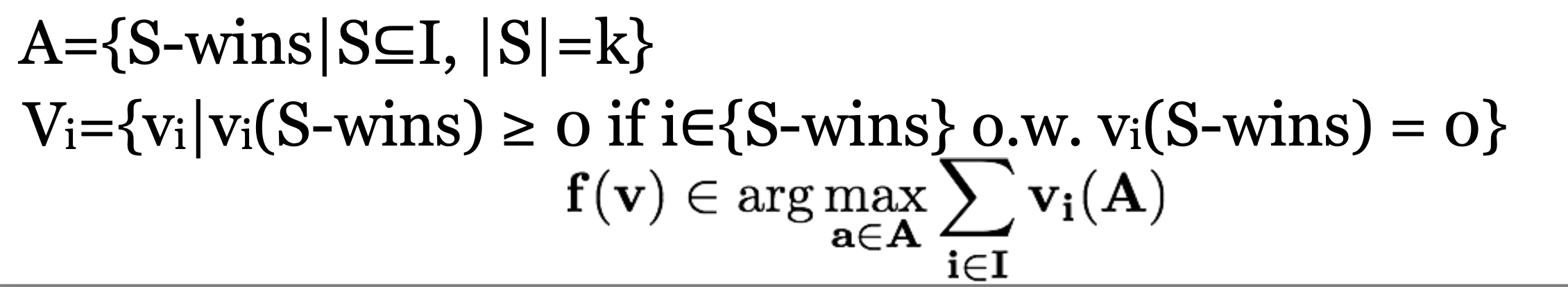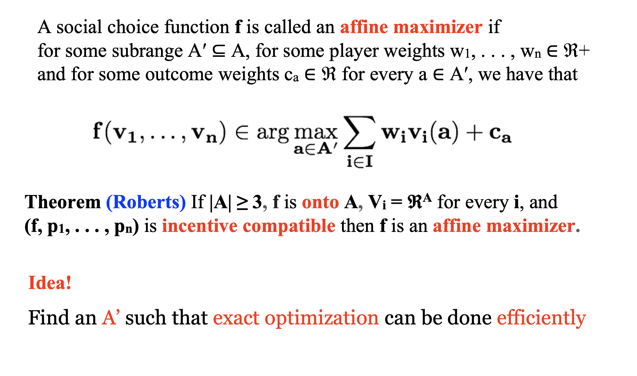- Theorem (Roberts) If |A| ≥ 3, f is onto A, Vi = RA for every i, and (f, p1, . . . , pn) is incentive compatible then f is an affine maximizer.