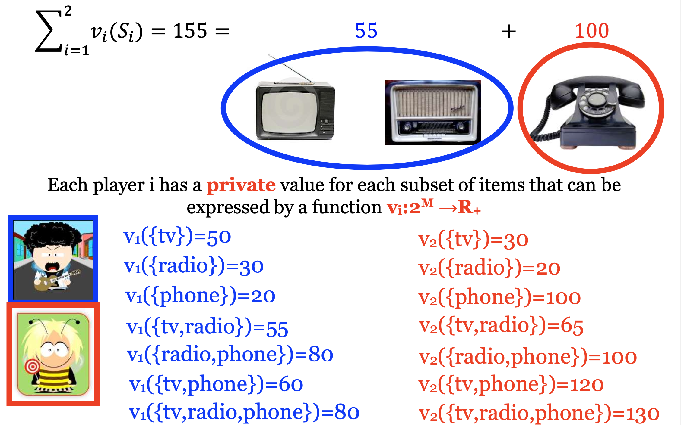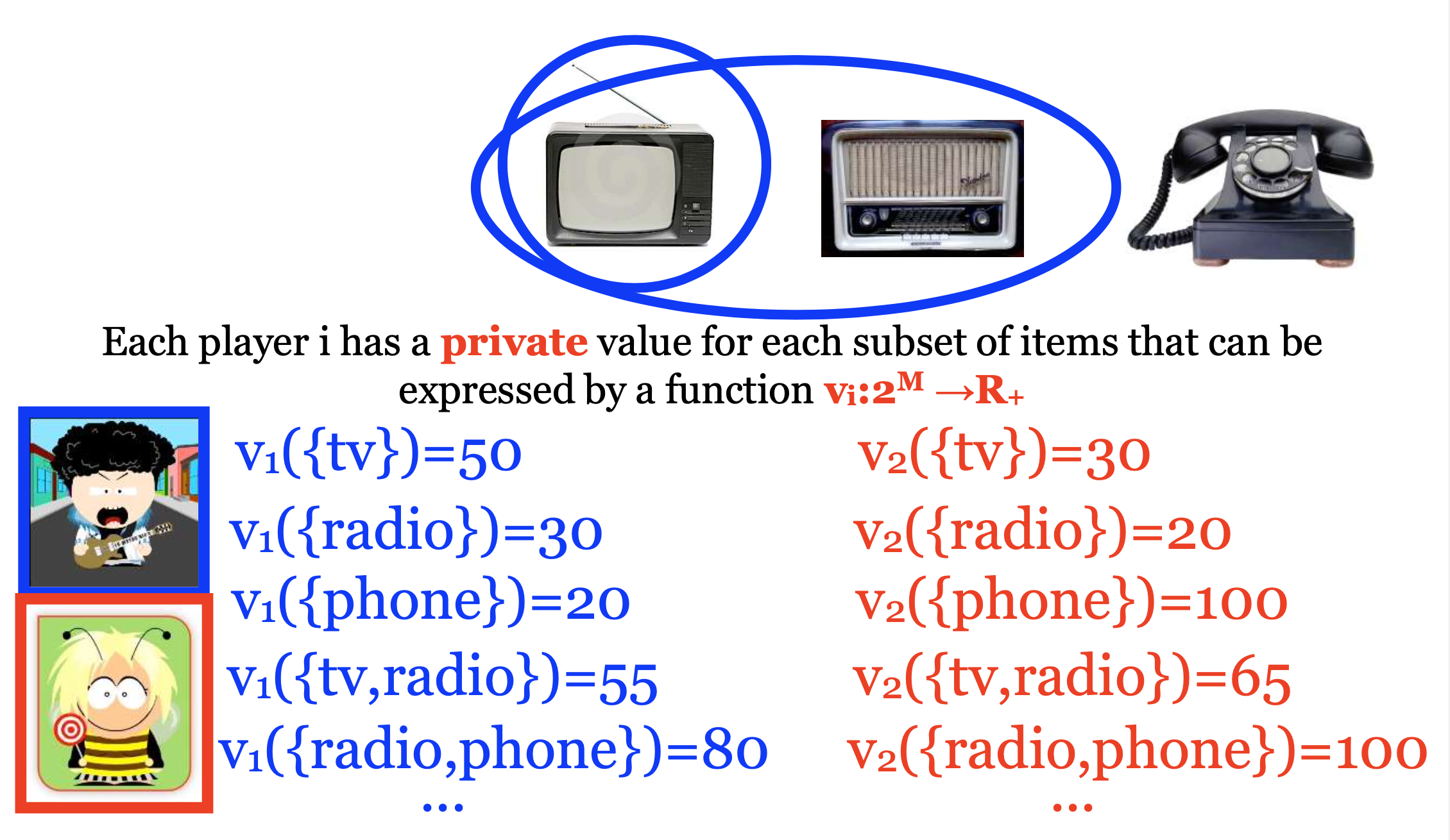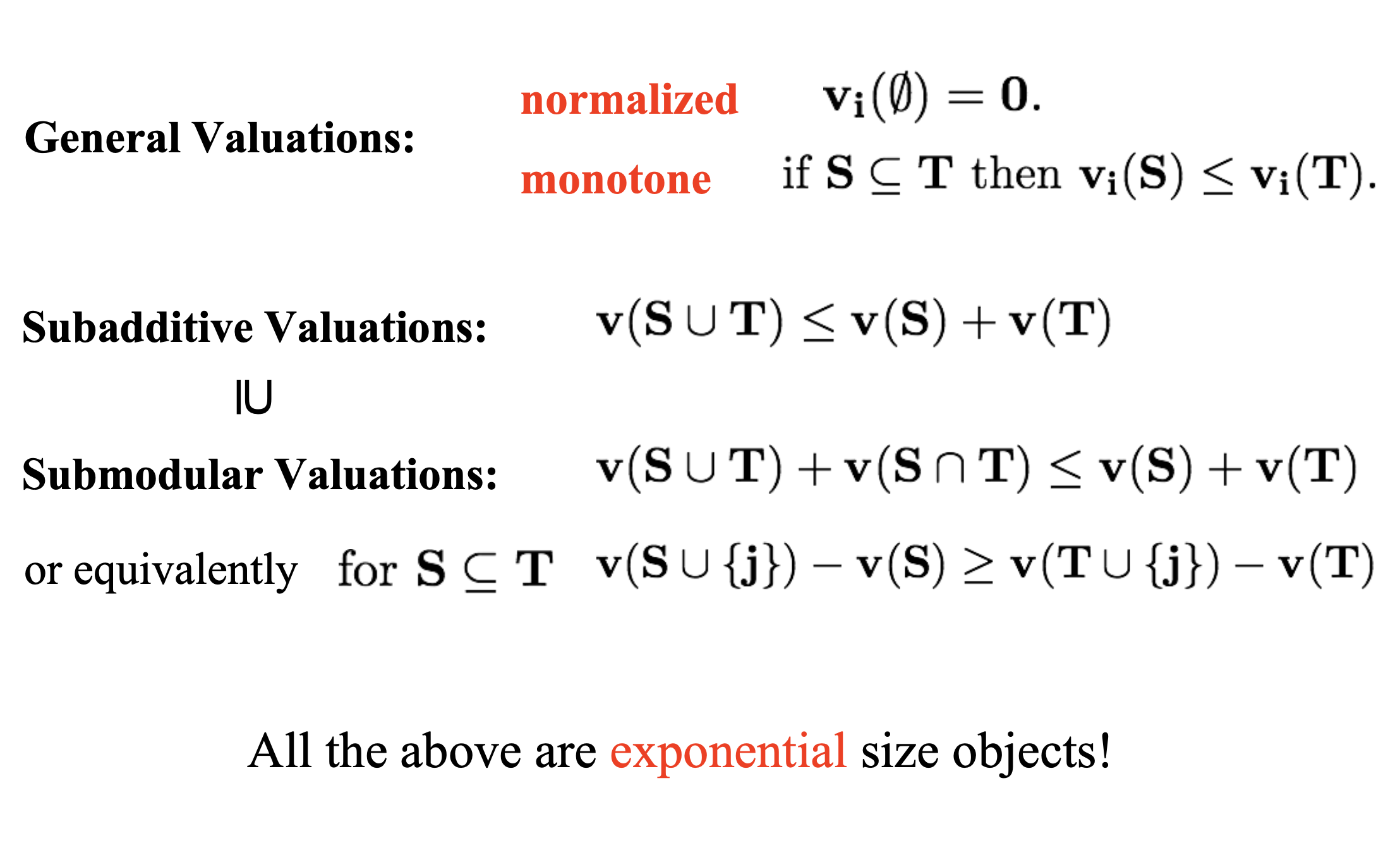 Bidders have preferences over subsets (bundles) of items A valuation is a real valued function for every subset S of items v(S) is the value the bidder obtains if he receives the bundle S
