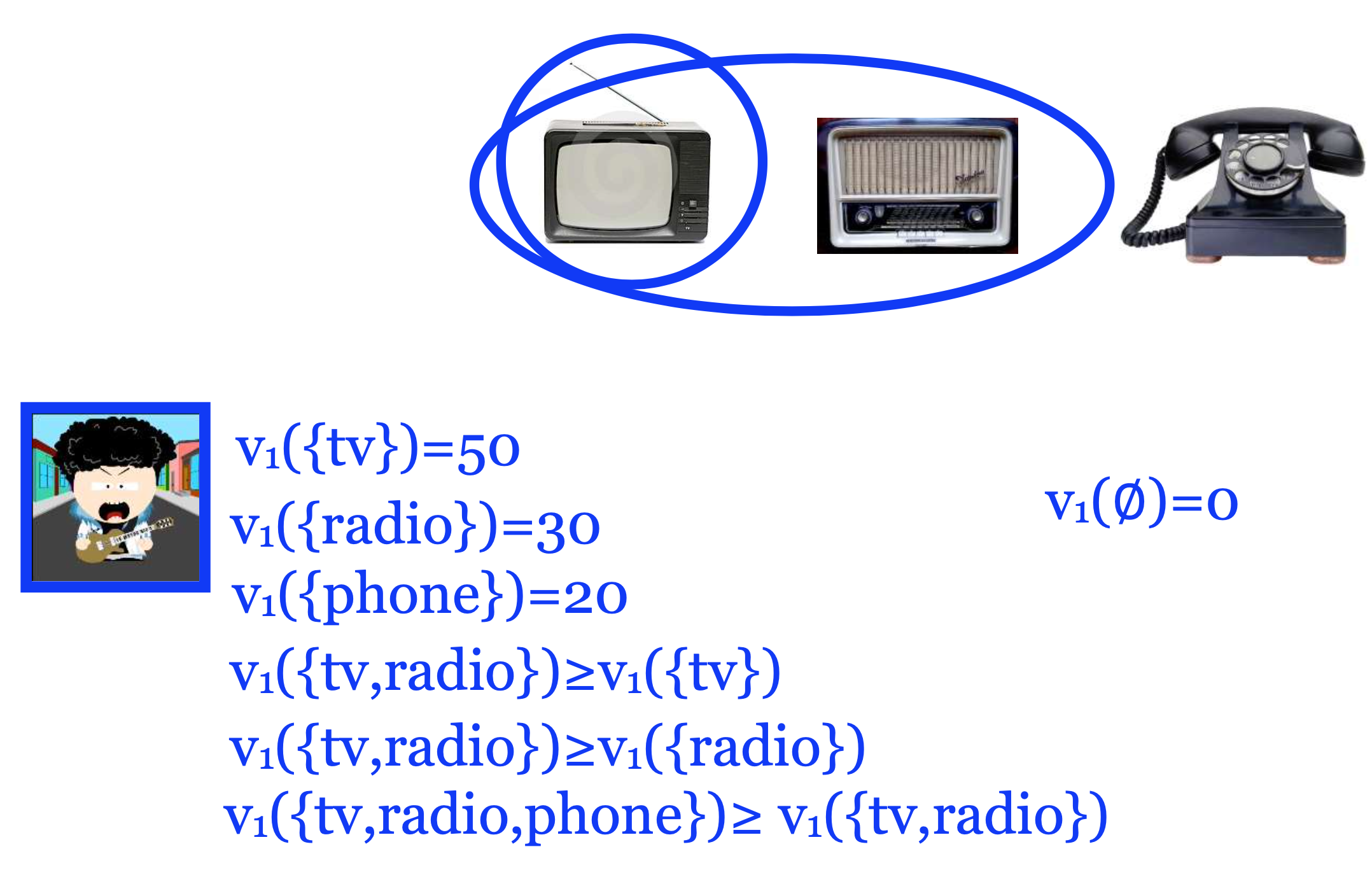 free disposal: monotone v(S)≤v(T) if S⊆T