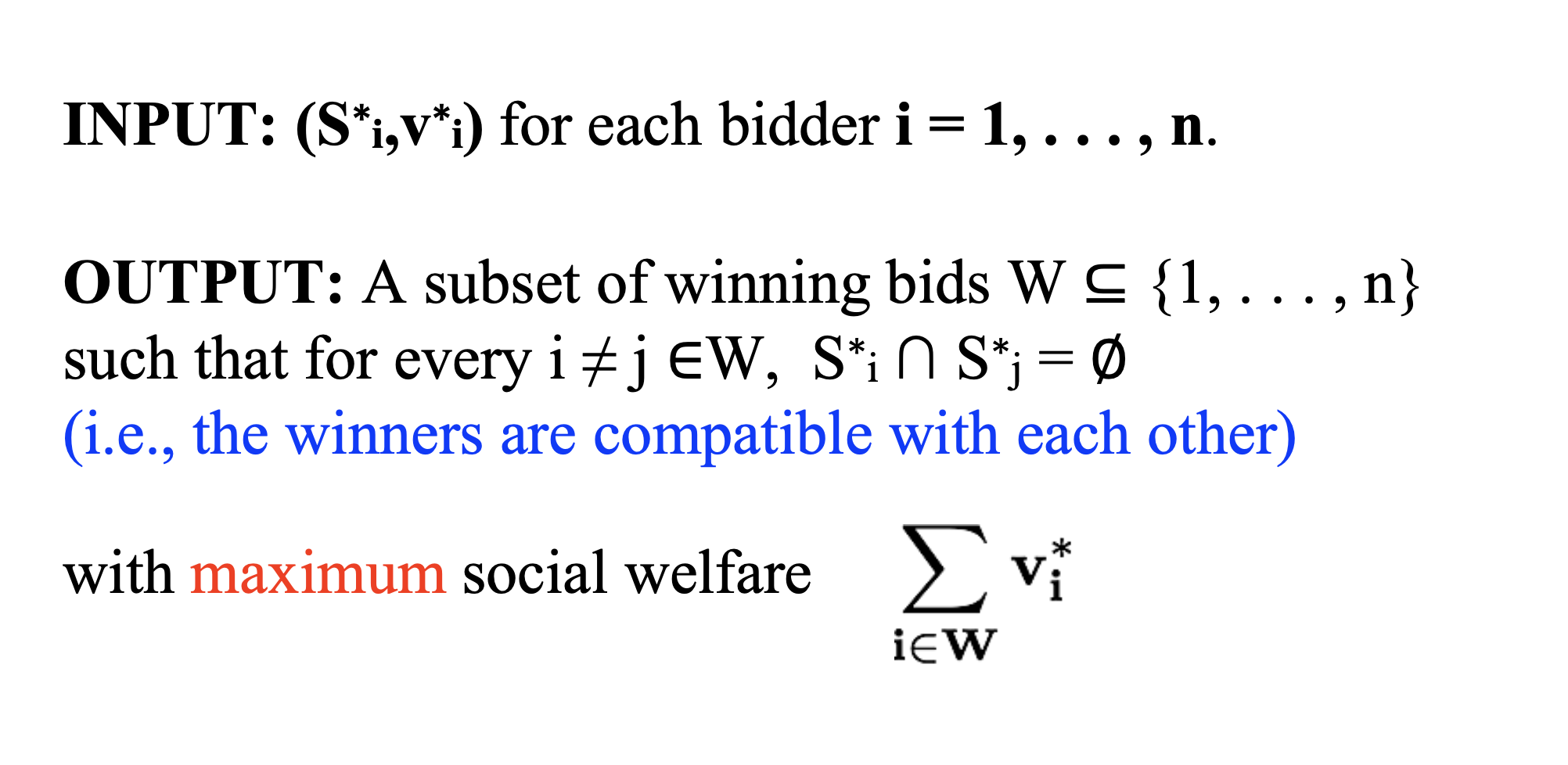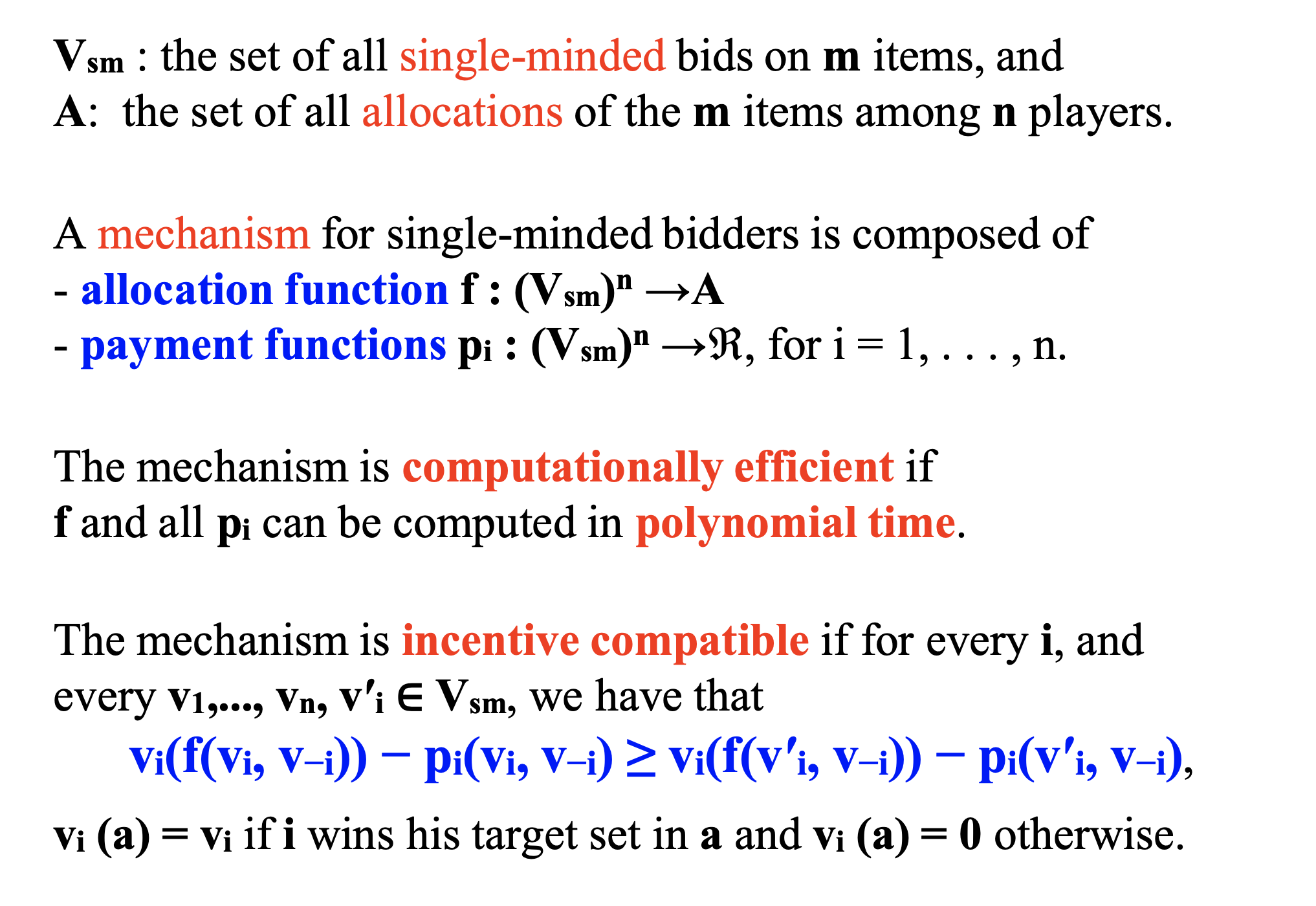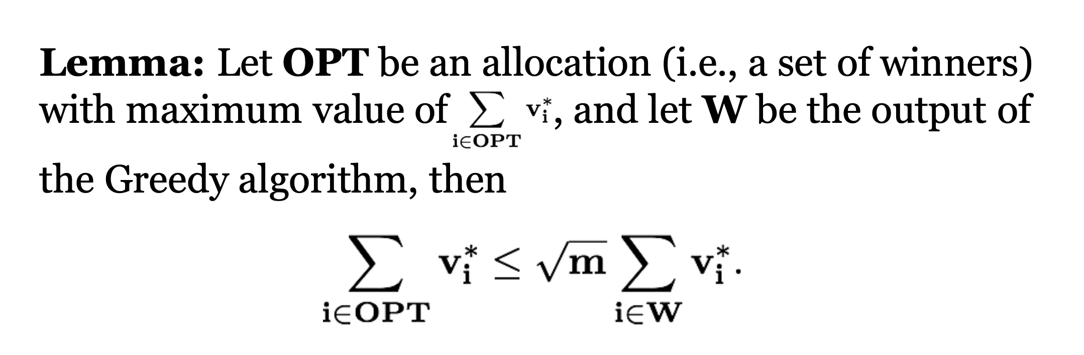 - Theorem. The Greedy mechanism is efficiently computable, incentive compatible and produces a m^1/2 approximation of the optimal social welfare.