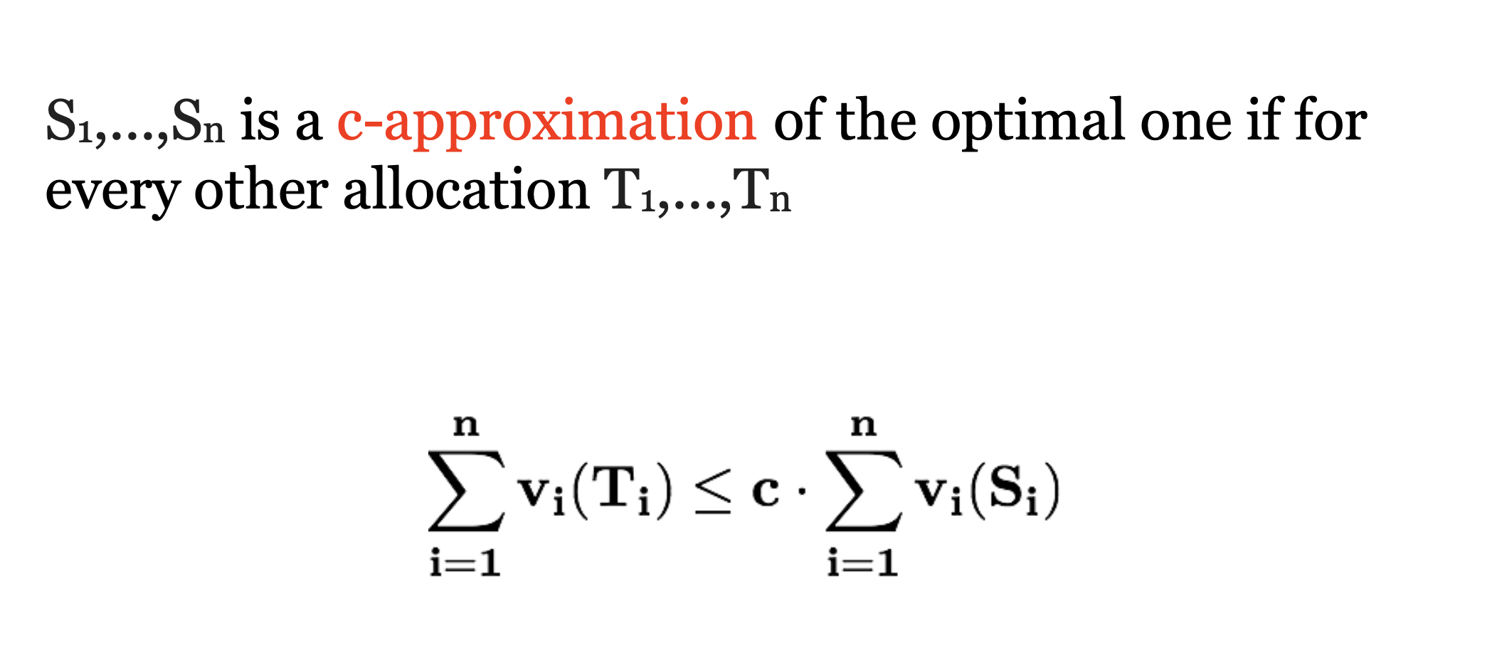 It maximizes the social welfare for (non-true) valuations vi(S) > v’i(S) > vi(S)/4 (where vi are the true valuation).
