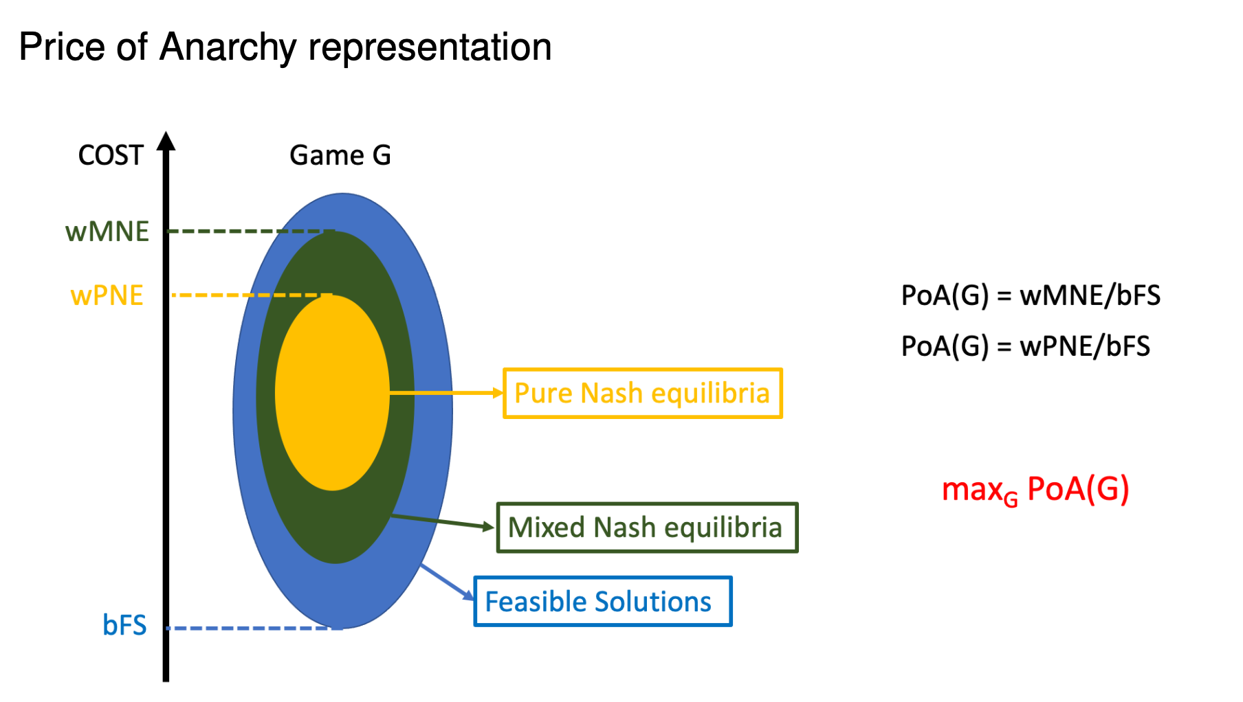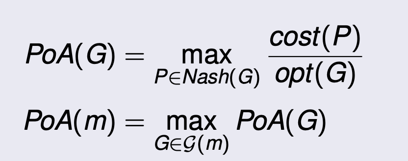 worst case ratio between the social cost in some Nash equilibrium (NE) and the optimum social cost.
