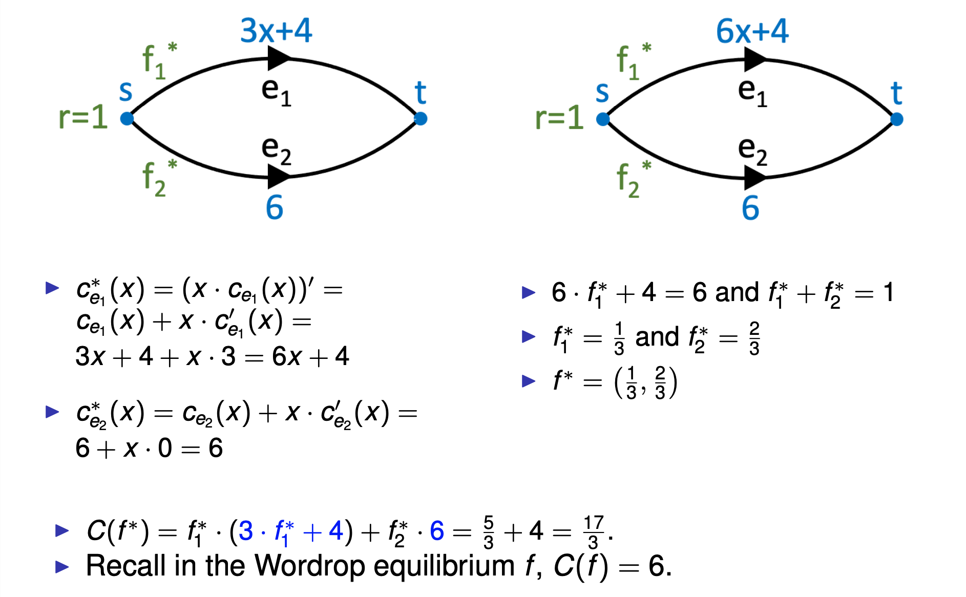 Theorem 3.2 (Wardrop equilibrium vs. Optimum): A feasible flow f is optimal for (G,r,c) if and only if f is a Wardrop equilibrium for (G,r,c∗).