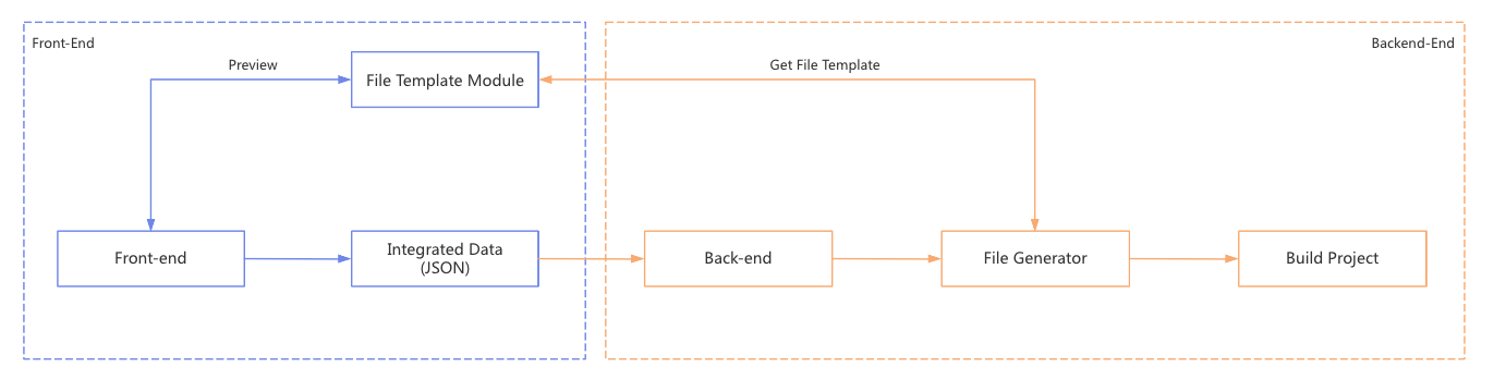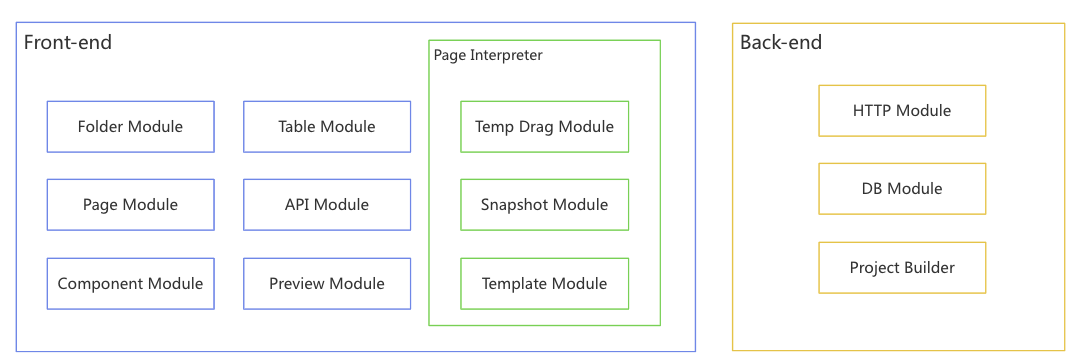 The Front-end is includes modules for managing folders, tables, pages, APIs, components, and previewing content, which handle user interactions and display.