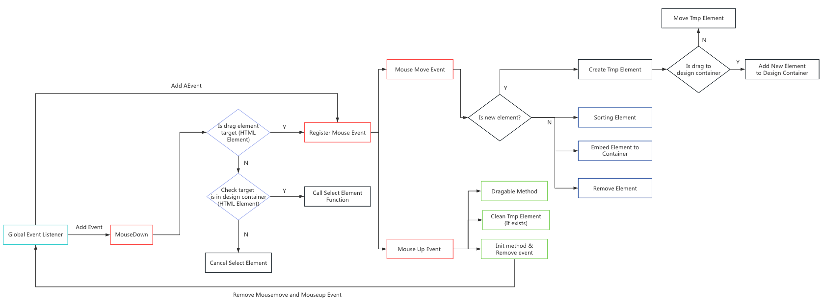 Firstly, the program will listen to the global mousedown event to identify the current target element. If the target element is a draggable element, the program will listen to the mousemove and mouseup events. The mousemove event is responsible for the functionalities of adding elements, sorting elements, moving elements, and deleting elements. Additionally, the mouseup event will confirm the final draggable event and subsequently remove the mousemove and mouseup event listeners, which means that it can reduce performance costs.