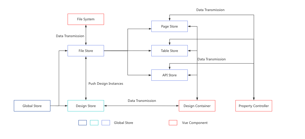 The file store is responsible for managing project files, and the file store has three substores: page store, table store, and api store. They are responsible for the data management of different types of files.