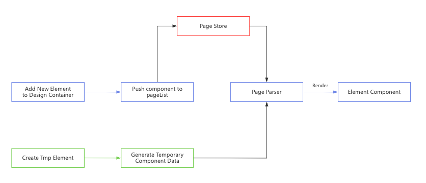 The program will push new element data to the global page store when the user drags a new element to the design container, and then the pager store will update element data dynamically in the page parser. Finally, the page parser will render element components.