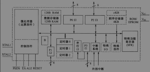 主要包括下列部件。1 个 8 位的 CPU、1 个布尔处理机、1 个片内振荡器、128 字节的片内数据存储器、4K 字节的片内程序存储器(8031 无)、寻址范围为 64K 字节的外部数据存储器和程序存储器、21 字节的专用寄存器、4 个 8 位并行 I/O 口、1 个全双工的串行口、2 个 16 位的定时器/计数器、5 个中断源、2 个中断优先级和 111 条指令,片内采用单总线结构。