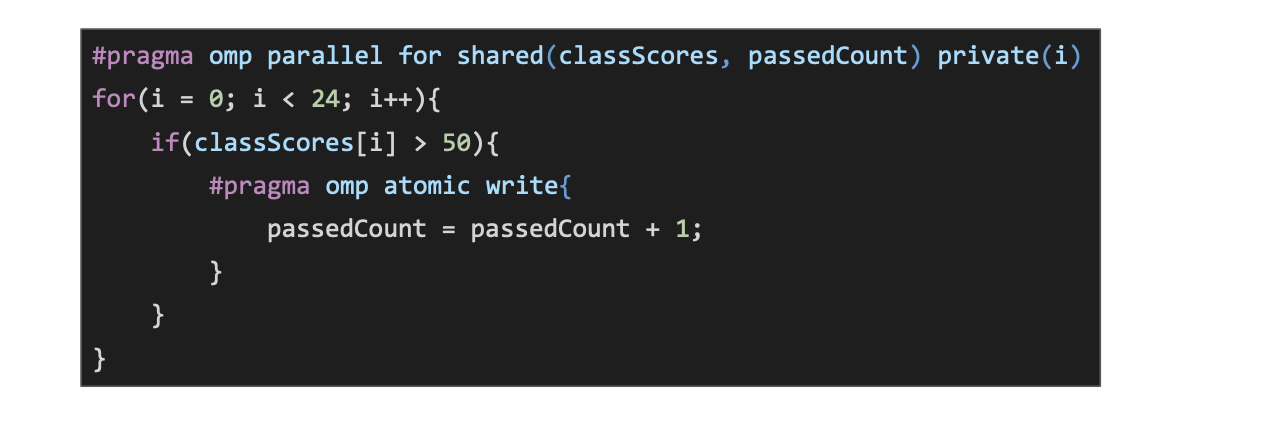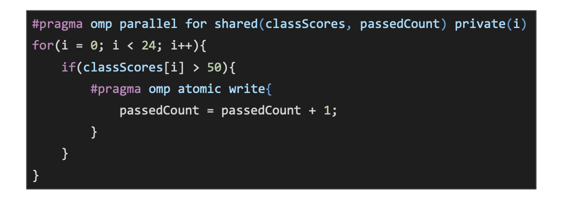 #pragma omp atomic write - This allows for a statement to receive exclusive write access, still allows for the variables to be read
