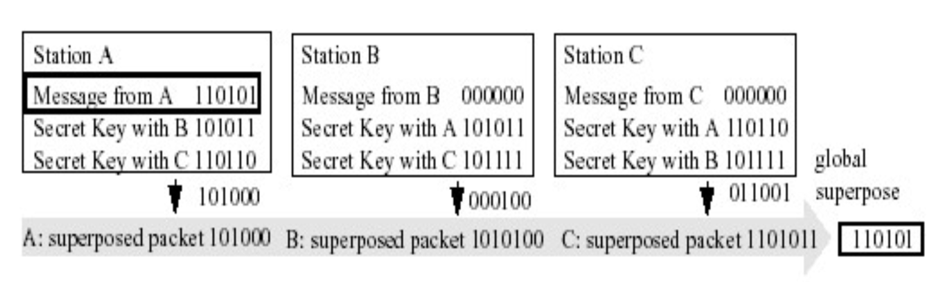 - To send a message M, a node, broadcast the value(M + K_ab + K_ac)