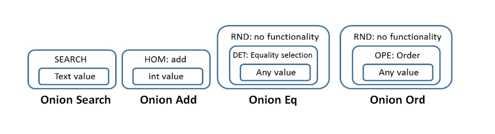 - All data in CrypDB can be encrypted using several layers of encryption;