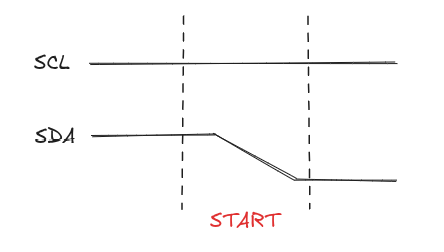 起始(START)信号: I2C 通信的起始信号由主设备发起,SCL 保持高电平,SDA 由高电平跳变到低电平。