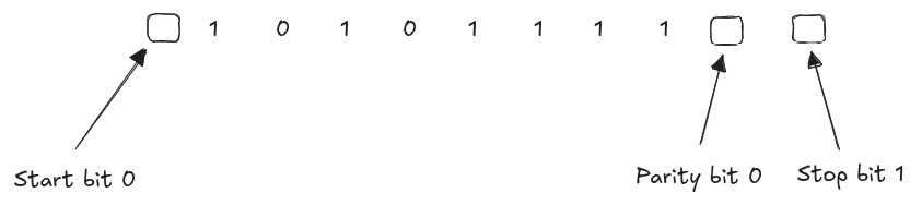 - 接收器丢弃数据帧中的起始位、奇偶校验位和停止位。